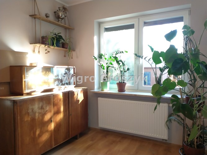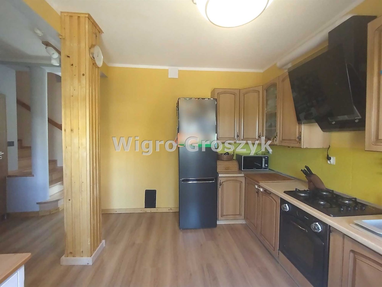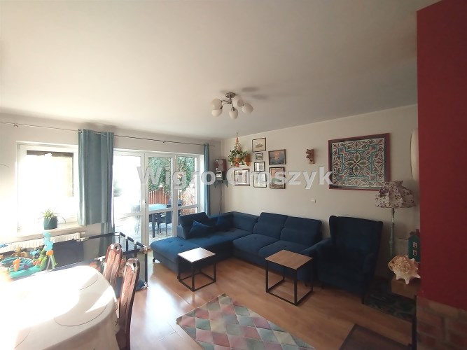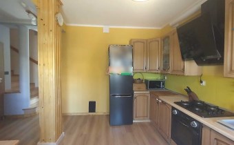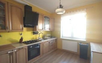Na parterze znajdują się pokój dzienny 24,7 m2, z kominkiem, z wyjściem na taras, pokój ok. 12 m2, kuchnia 11 m2 (wyposażona w chłodziarko-zamrażarkę, kuchenkę gazowo-elektryczną, piekarnik elektryczny), łazienka z toaletą i natryskiem, korytarz oraz wiatrołap. Z wiatrołapu jest przejście do garażu. Kuchnia jest przestronna, doświetlona dużą ilością światła dziennego i częściowo otwarta na korytarz.