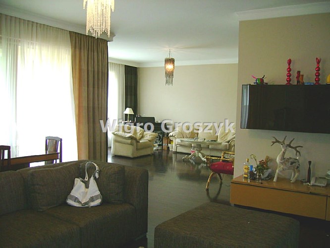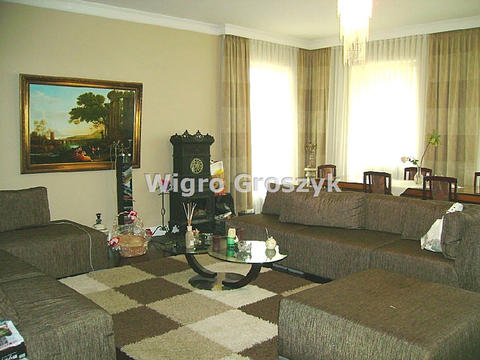 Atrakcyjny dom w zabudowie bliźniaczej, położony w Dąbrowie-prestiżowej i luksusowej części Łomianek, w dobrym sąsiedztwie. Dom wybudowany z bardzo dobrych materiałów, komfortowo wykończony, wyposażony i umeblowany. NA PARTERZE znajduje się duży, słoneczny, przestronny salon o powierzchni ok.40m2 z wyjściem na duży taras, kuchnia ok. 15 m2 (z nowoczesną zabudową i sprzętem AGD), jadalnia ok. 24m2, hol ok. 15 m2, łazienka ok. 5 m2, garderoba ok.7m2, pomieszczenie gospodarcze ok. 10m2, kotłownia ok.10m2, garaż ok.48m2. NA PIĘTRZE znajdują się cztery przestronne i słoneczne sypialnie, (jedna z osobnym dużym pokojem kąpielowym i garderobą) o powierzchniach ok; 20m2 22 m2, 22m2, 32 m2, łazienka ok.17m2, garderoba ok.5 m2. Dom wyposażony jest w instalację alarmową z monitoringiem, ogrzewanie podłogowe - sterowane automatycznie, bramę wjazdową oraz bramy garażowe automatyczne, sterowane pilotem. Poza czynszem najmu najemca opłaca opłaty licznikowe (gaz, prąd) i eksploatacyjne (wywóz nieczystości).