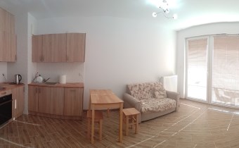 W zabudowie aneksu kuchennego jest zlew, zmywarka,piekarnik,płyta indukcyjna,lodówko-zamrażarka,okap,,czajnik elektryczny,ale także akcesoria kuchenne takie jak garnki czy pełna zastawa stołowa. W salonie jest wygodna kanapa z funkcją spania, stół,siedziska, szafka na telewizor. Z pokoju dziennego jest wyjście na 4,4m2 loggię ze stolikiem i krzesłami.