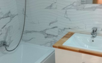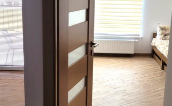W sypialni jest szafa i duże, wygodne łóżko. W łazience jest wanna,umywalka,sedes i szafki.